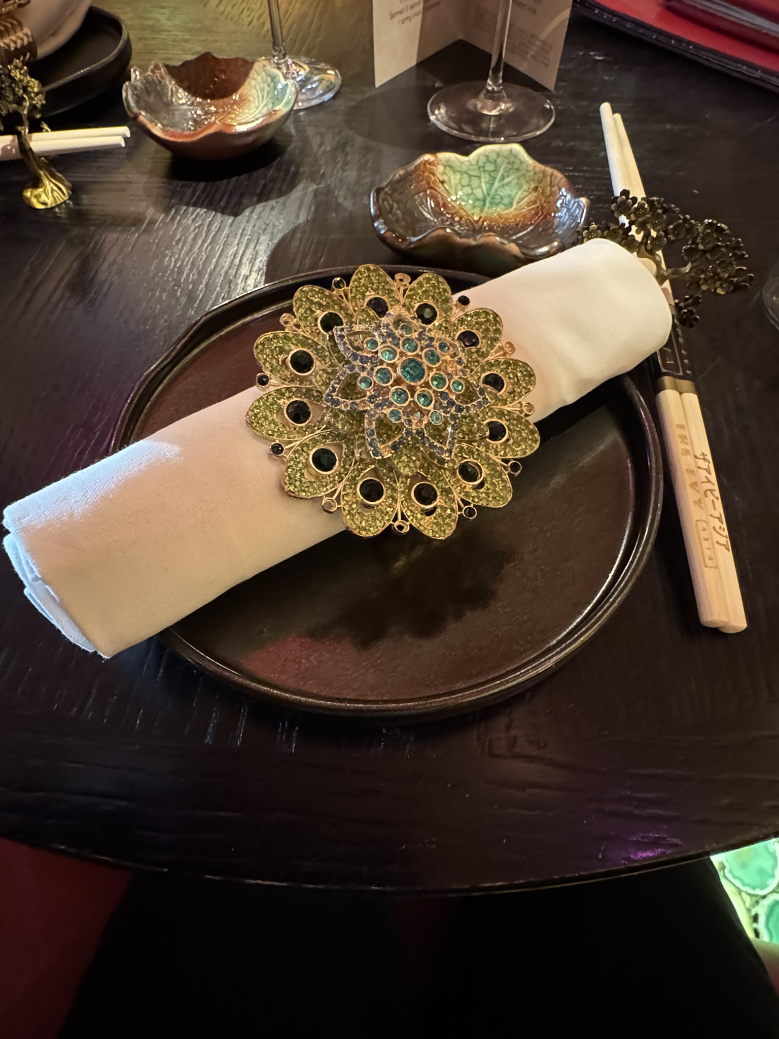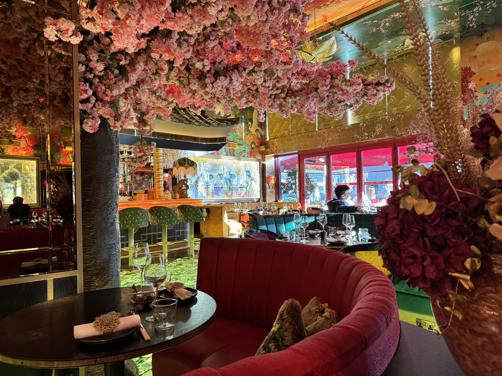 The venue itself is a masterpiece. Walking in feels like stepping into another world – the iconic abalone floor, opulent cherry blossoms, golden Buddhas, and vibrant hues create an immersive visual experience that stuns from every angle. Add in a warm welcome with full cloakroom service, impeccably dressed staff, and elegant table settings – this is luxury dining done right.